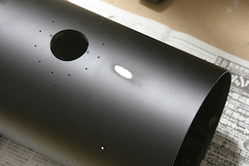 まずは先月の塗装の続きから。各部品の塗装後、注意して取り扱ったつもりだったが、乾燥中に煙室の塗膜に傷が入ってしまった(左)。修復に先立ち、1000番のペーパーで傷の周囲を削り、表面を平らに均した(右)。