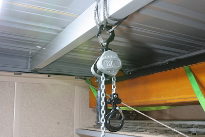 ボイラーを組み立てた状態だと40kgほどもあり、さすがに持ち上げることができないので、レバーホイストで吊り上げて搭載することにした。組立小屋の天井板は外しており、天井梁にワイヤーを巻き、レバーホイストを取り付けた。天井梁の強度はそれほど期待できないが、ボイラー程度であれば問題ない。