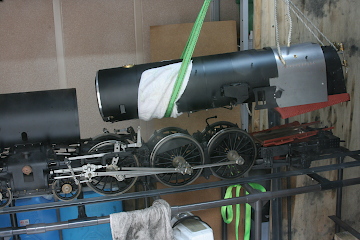下まわりに煙室と灰箱を取り付け、ボイラーを吊り上げて搭載する。吊掛ロープで塗膜に傷が付かないように、タオルで養生した。ボイラー後端を膨張受けに載せ、前端は煙室に差し込み、煙室内部からボルトで固定し、継ぎ目にボイラーバンドを巻く。