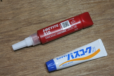 今回、バルブ、フランジ等のシールには、ロックタイト510ではなく、バスコークを用いた。ロックタイトはシール性は高いが、接着力が強すぎて、分解時に部品にダメージを与える可能性がある。バスコークは製造後の寿命が短いという欠点があり、新品でまとめて作業をする方が良い。