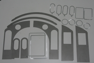 Once the shape of the front sheet was confirmed, the remaining cab parts were prepared with laser cutting. They are the front and rear sheets, the front door, and the roof valance, all in 1.6 mm thickness, while the various window frames were made from 0.8 mm material. Due to material availability, the window frames were cut from bonderized steel sheet.