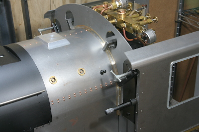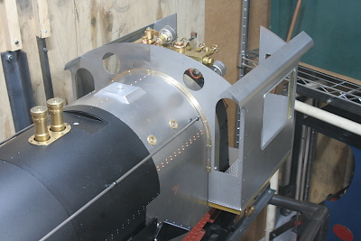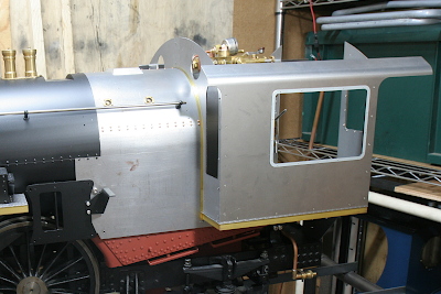 At this stage, the cab is assembled and mounted on the main body to check all dimensions. The gap between the cab front sheet and the boiler cleadings is temporarily packed with a brass strip (boiler band material). For ease of assembly and machining, the front sheet is made in left and right halves, joined at the center by a backing plate fitted from the inside.